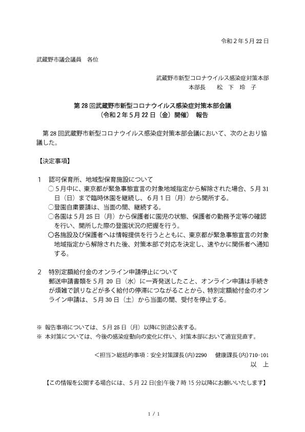 第28回武蔵野市新型コロナウイルス感染症対策本部会議(令和2年5月22日(金)開催)報告第28回武蔵野市新型コロナウイルス感染症対策本部会議において、次のとおり協議した。【決定事項】1、認可保育所、地域型保育施設について○5月中に、東京都が緊急事態宣言の対象地域指定から解除された場合、5月31日(日)まで臨時休園を継続し、6月1日(月)から開所する。○登園自粛要請は、当面の間、継続する。○各園は5月25日(月)から保護者に園児の状態、保護者の勤務予定等の確認を行い、開所した際の登園状況の把握を行う。○各施設及び保護者へは情報提供を行うとともに、東京都が緊急事態宣言の対象地域指定から解除された後、対策本部で対応を決定し、速やかに関係者へ通知する。2、特別定額給付金のオンライン申請停止について郵送申請書類を5月20日(水)に一斉発送したこと、オンライン申請は手続きが煩雑で誤りなどが多く給付の停滞につながることから、特別定額給付金のオンライン申請は、5月30日(土)から当面の間、受付を停止する。※報告事項については、5月25日(月)以降に別途公表する。※本対策については、今後の感染症動向の変化に伴い、対策本部において適宜見直す。<担当>総括的事項:安全対策課長(内)2290健康課長(内)710-101以上